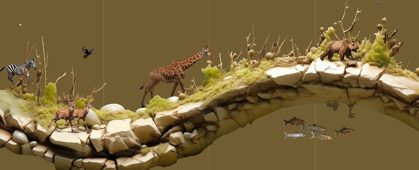 Scroll farther down, more interesting images. I actually really like this one—zebras, deer, giraffes, bears, and fish amble (or swim) along a picturesque fossil or maybe a winding path of rocks.