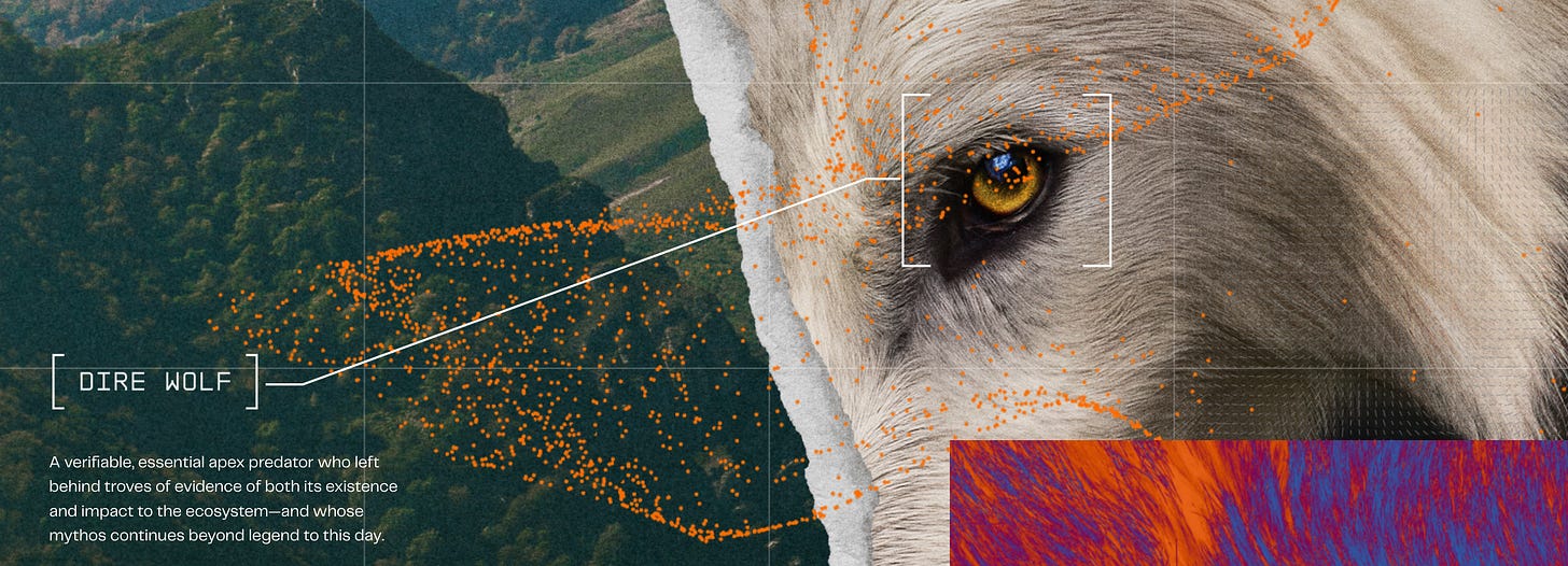 The landing page is an incredible feat of graphic design. Short clips of snow-white dire wolves trotting in the forest, scientists handling samples in the lab, scenic forest foliage (from the POV of prey, might I add), and other “aesthetic” shots alternate in a looped video. Right in the middle, some text: