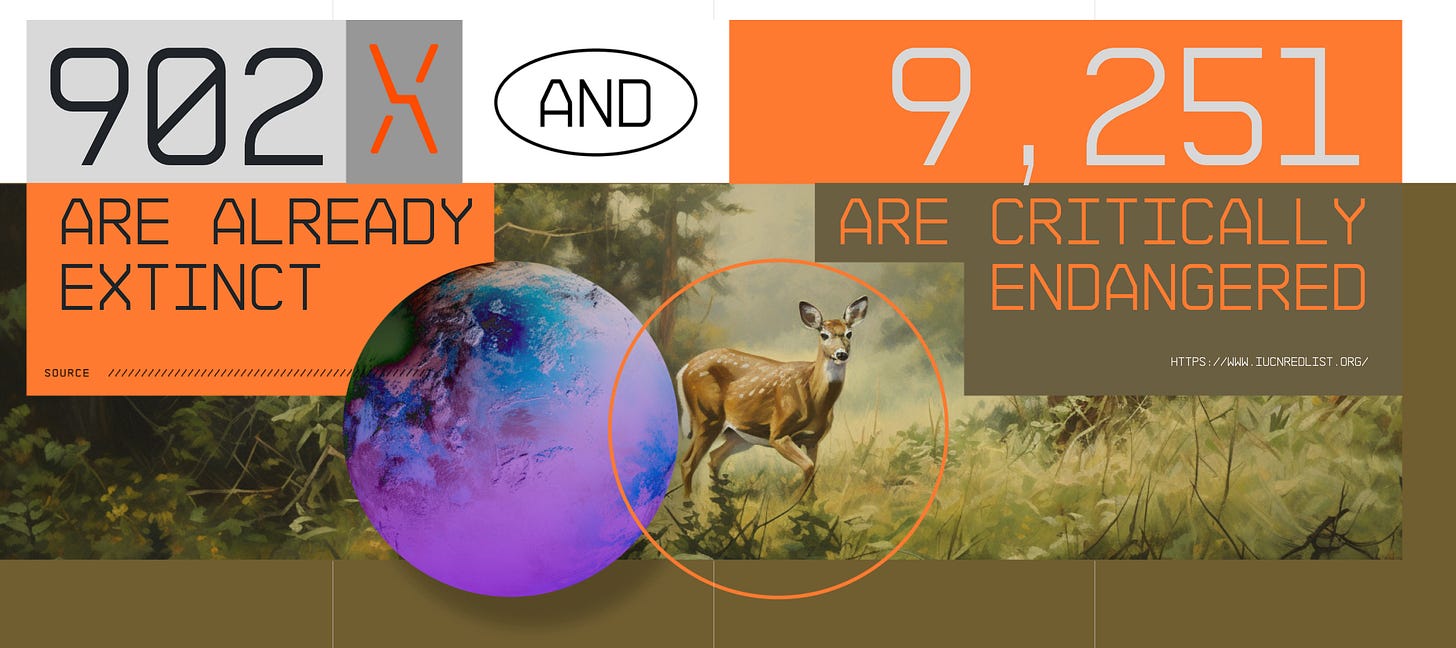If we scroll down, we see various collages of different animals overlayed with text akin to futuristic computer output or code. Lots of messages about the pressing need to protect extinct and critically endangered species.